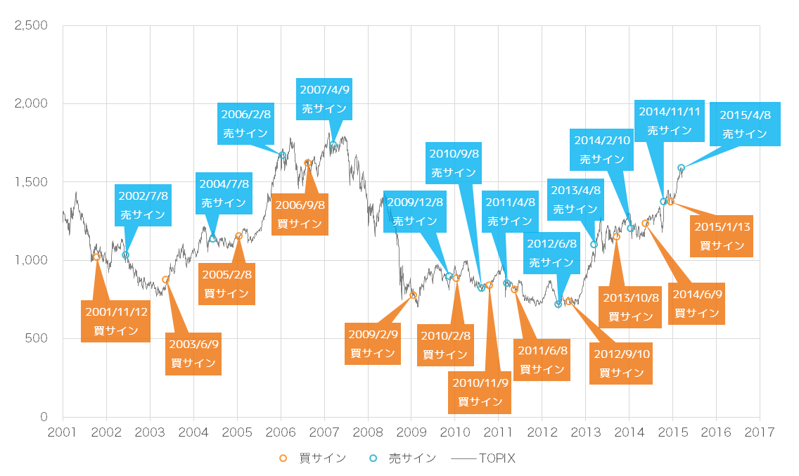 2001年から現在までの売買サインとTOPIXの推移です。