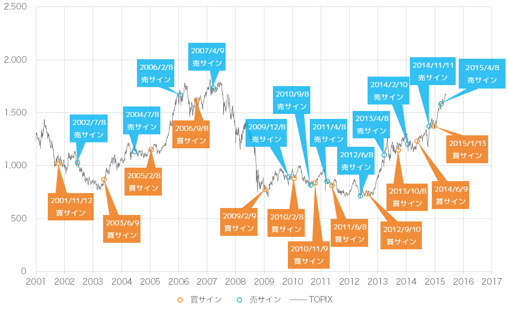 2001年から現在までの売買サインとTOPIXの推移です。