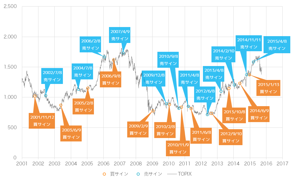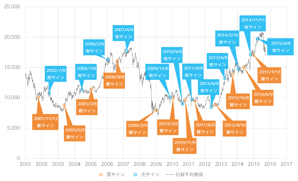 2001年から現在までの売買サインと日経平均株価(日経225)の推移です。日経平均株価は結局21,000円を抜けられないまま8月下旬から下落に転じ、2015年初頭の水準まで戻ってしまいました。