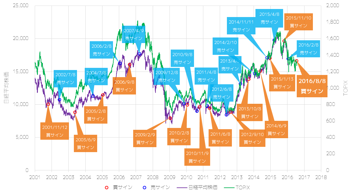 2001年から現在までの売買サインと日経平均株価(日経225)&TOPIXの推移です。