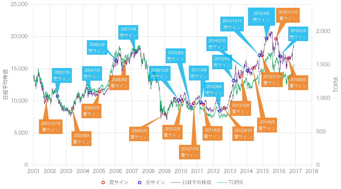 2001年から現在までの売買サインと日経平均株価(日経225)&TOPIXの推移です。