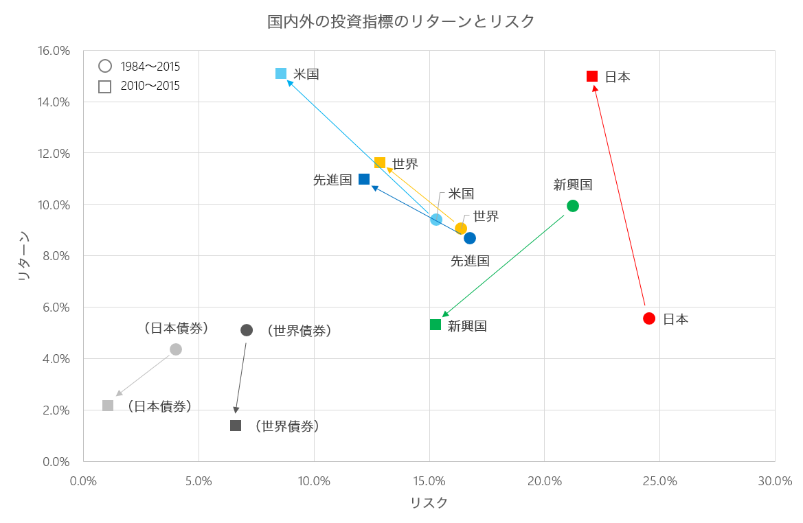 ○で表したものが1984年から現在のリスク・リターン、□で表したものが2010年から現在のリスク・リターンです。