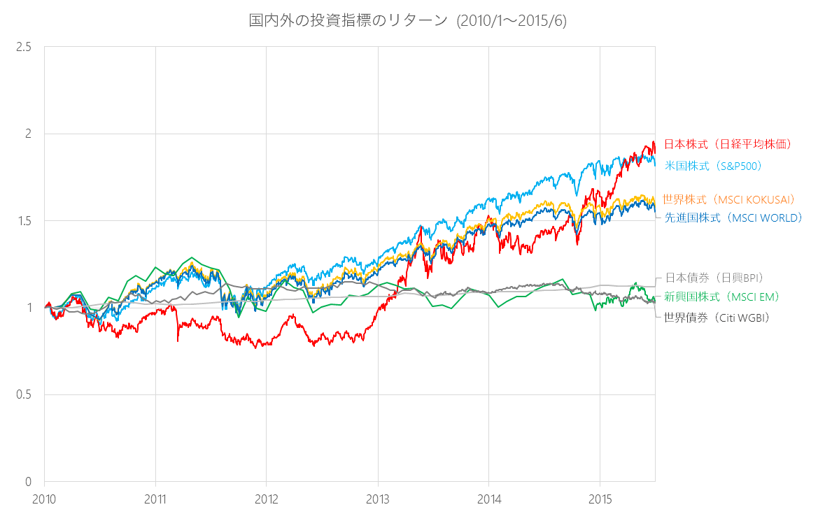 まずリーマンショック後の2010年ごろからの6年間で国内外の株式や債券のインデックスがどのように変化したかを見てみます。