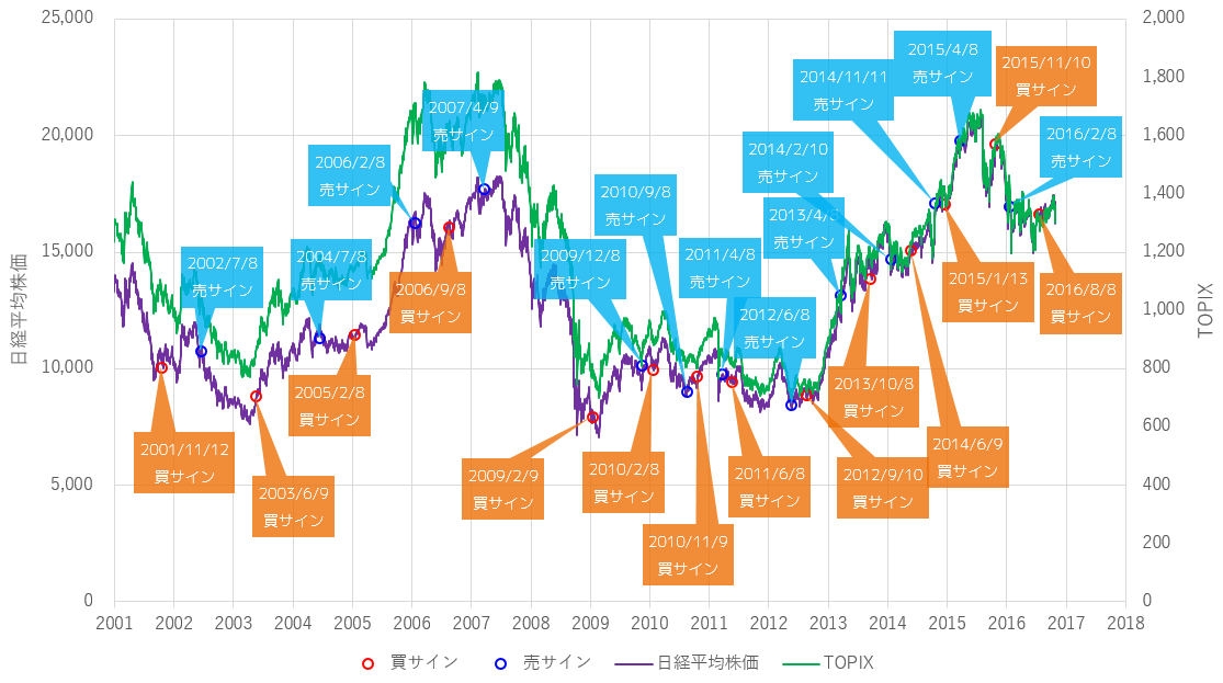 2001年から現在までの売買サインと日経平均株価(日経225)&TOPIXの推移です。